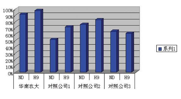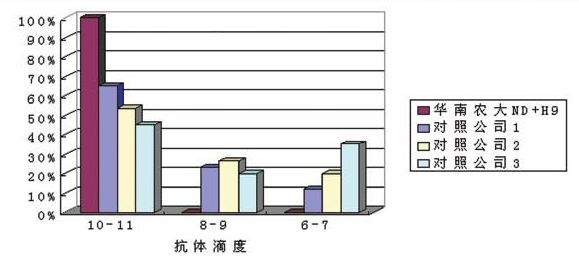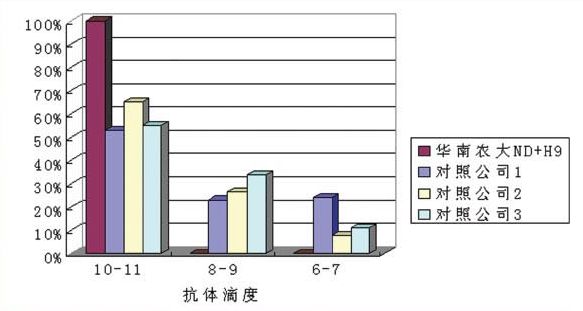 華南農(nóng)業(yè)大學(xué)獸醫(yī)學(xué)院針對近年國內(nèi)流行H9毒株和新城疫強毒作分析比較,挑選山東、河南、河北、廣西等 有代表性的禽流感H9N2病毒和新城疫強毒各近100株作為攻擊病毒,分別以上述病毒攻擊以用廣州市華南農(nóng)大生物藥品有限公司精品系列油苗一ND+H9和國內(nèi)其他廠家的疫苗免疫的試驗雞,計算發(fā)病雞數(shù)量,統(tǒng)計不同疫苗之間的保護率,發(fā)現(xiàn)廣州市華南農(nóng)大生物藥品有限公司生產(chǎn)的精品系列油苗一ND+H9對上述攻擊野毒都有較好的保護作用。