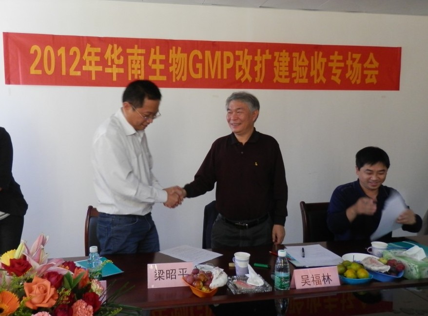 根據《獸藥生產質量管理規范》的規定,依照《獸藥生產質量管理規范檢查驗收辦法》,農業部獸藥GMP工作委員會辦公室指派吳福林、張廣川、魏財文、楊承槐4名檢查員擔任我司獸藥GMP驗收工作;廣東省畜牧獸醫局選派羅建民、李躍龍兩名同志擔任觀察員,共赴廣州市華南農大生物藥品有限公司,對公司改擴建的胚毒滅活疫苗生產線、細胞毒滅活疫苗生產線進行為期2天的獸藥GMP現場檢查驗收。