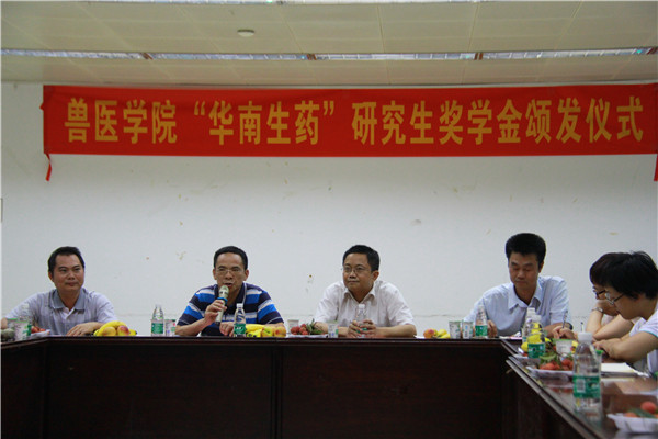 活動首先由梁梓森書記代表學院致辭,衷心感謝廣州市華南農大生物藥品有限公司在獸醫學院設立研究生獎學金勉勵獸醫學子勤奮學習、進取有為,并對獲獎同學表示祝賀,希望同學們能再接再厲,不辜負企業與學院的期望。此外,梁書記還結合華南生藥兩位總經理的創業經歷給大家上了一堂簡短生動的創業培訓課,在啟發同學們開拓個人發展的同時也祝愿華南生藥公司的發展越來越好。企業代表梁昭平總經理向大家介紹了華南農大生物藥品有限公司的基本情況,并介紹了企業來學院設立獎學金的初衷是以關注研究生個人發展為出發點,通過設立獎學金為紐帶增進校企間的科技、文化交流,進而深化產學研合作的形式,實現校企優勢互補、互利共贏,希望同學們以獲得獎學金資助為鞭策,加倍努力規劃好自己的學業和能力。