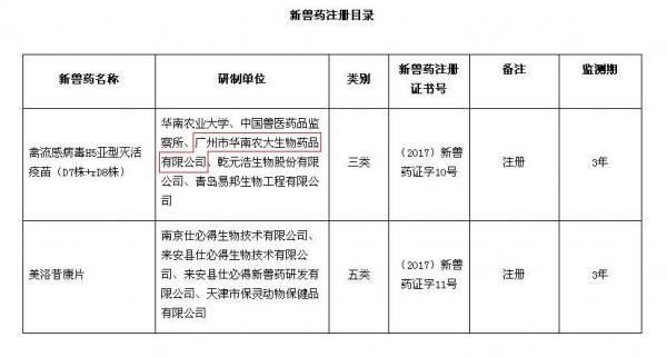 熱烈祝賀華南生物禽流感病毒H5亞型滅活疫苗(D7株+rD8株)獲新獸藥證書