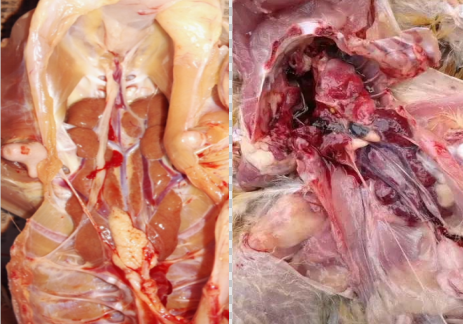 觀察雞群狀況,根據(jù)發(fā)病日齡、臨床癥狀、流行病學(xué)和死亡規(guī)律;解剖察看病理變化,若有上述特征性病變則可初步診斷;進一步診斷還需要采集病料(主要肝、腎、肺臟等病變組織),實驗室做核酸檢測。