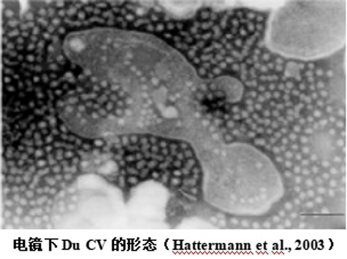 最早在2002年,德國科學(xué)家Hattermann 發(fā)現(xiàn)勃蘭登堡某養(yǎng)鴨場的法國番鴨表現(xiàn)出羽毛凌亂、生長遲緩、體重減輕等癥狀,認(rèn)為這與其他禽類感染圓環(huán)病毒后的臨床特點很相似,于是對樣品進行負(fù)染電鏡(EM)檢測發(fā)現(xiàn),法氏囊中存在無囊膜的球狀病毒,直徑大約為 15~16nm。最終根據(jù)圓環(huán)病毒rep基因的鑒定,發(fā)現(xiàn)與其他圓環(huán)病毒同源性僅39%~60%,與鵝圓環(huán)病毒同源性最高,但也僅為82%。推斷新發(fā)現(xiàn)的可能為新的圓環(huán)病毒,鴨圓環(huán)病毒DuCV。